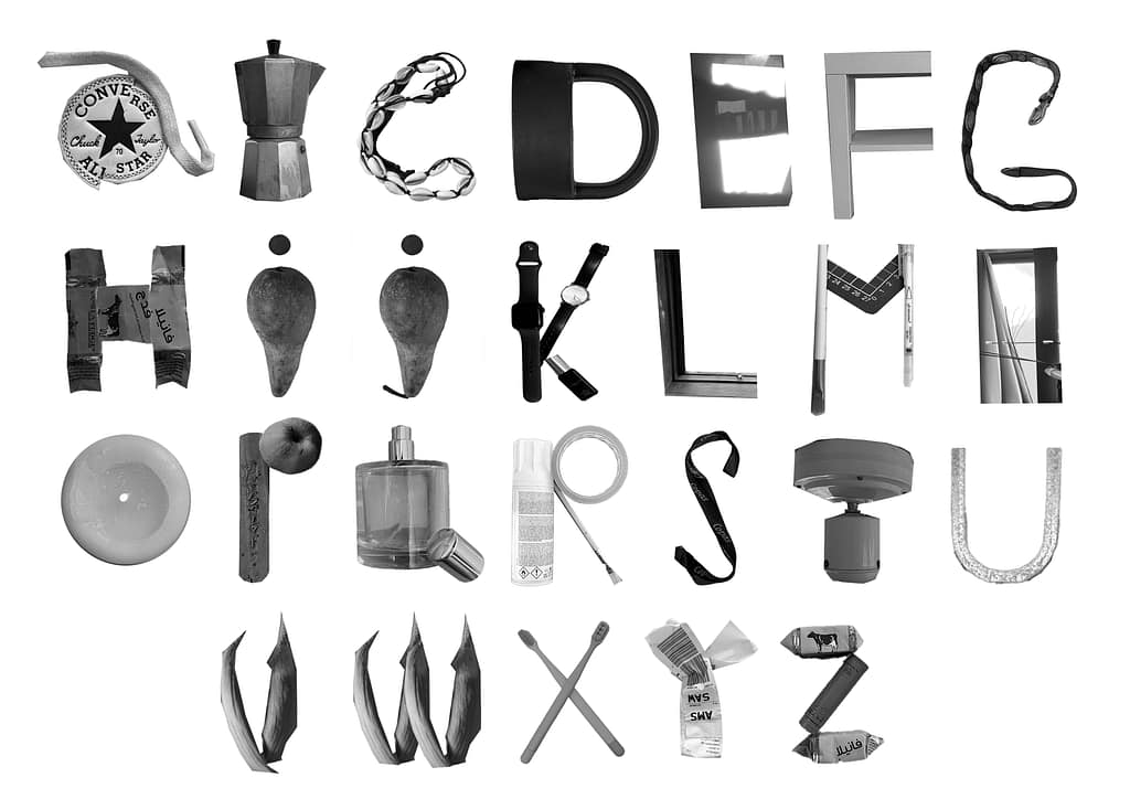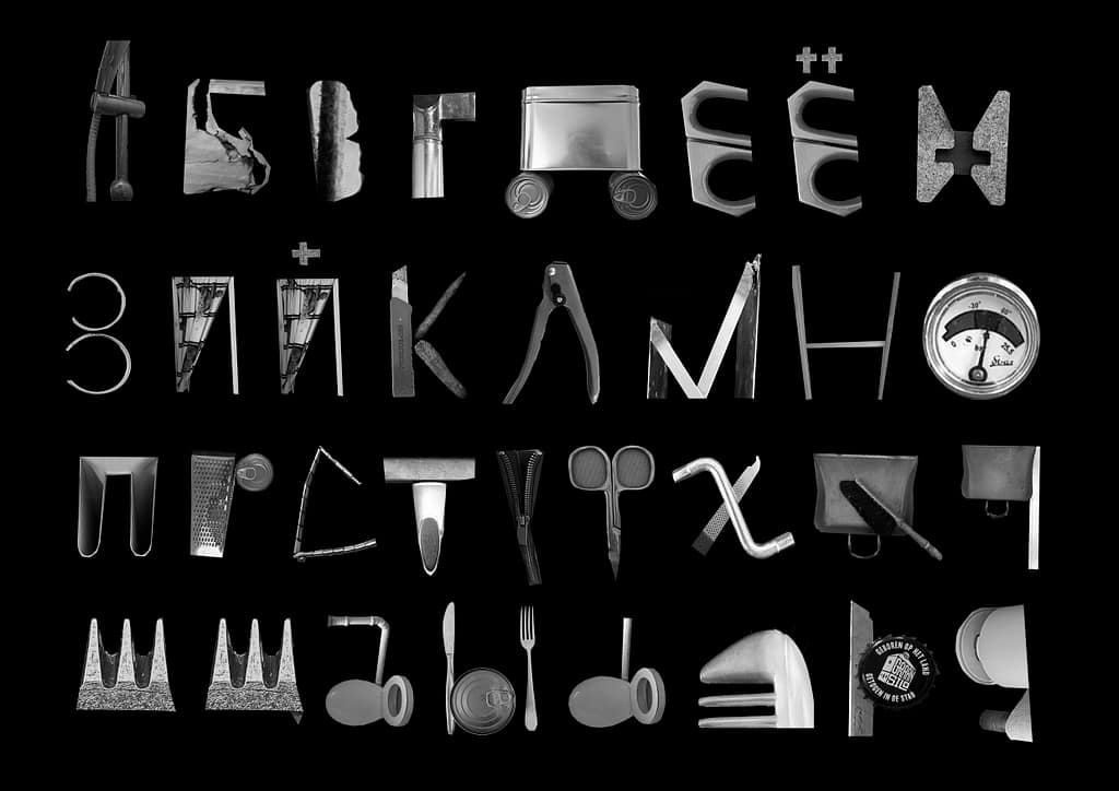 The Cyrillic alphabet has sharper, more angular and rigid forms. I mainly used metallic objects and details from my room to construct it.