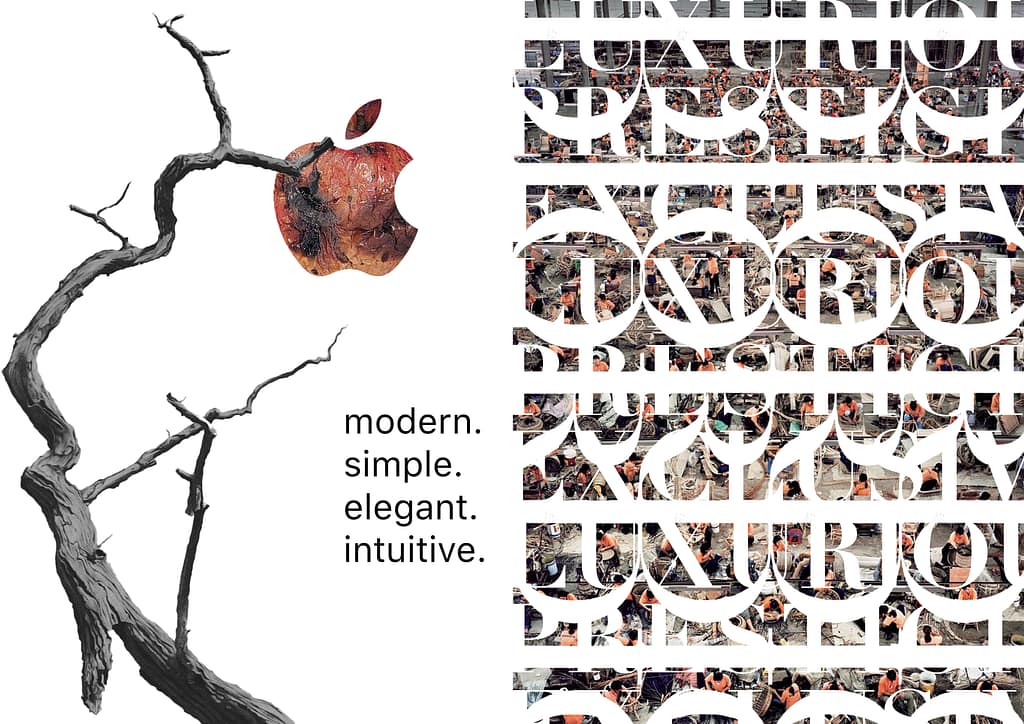 On the first page, the Apple logo appears as a rotting apple hanging on a dried tree. This image contrasts sharply with the accompanying text, set in Apple’s signature typeface, San Francisco. Using this font, I wrote the words Modern, Simple, Elegant, Intuitive, qualities often associated with the brand. However, behind these descriptors, the spread functions as a form of social and environmental critique, addressing issues of ecological impact and the way branding can mask underlying realities. The tension between the clean typography and the decaying visual highlights this contradiction.