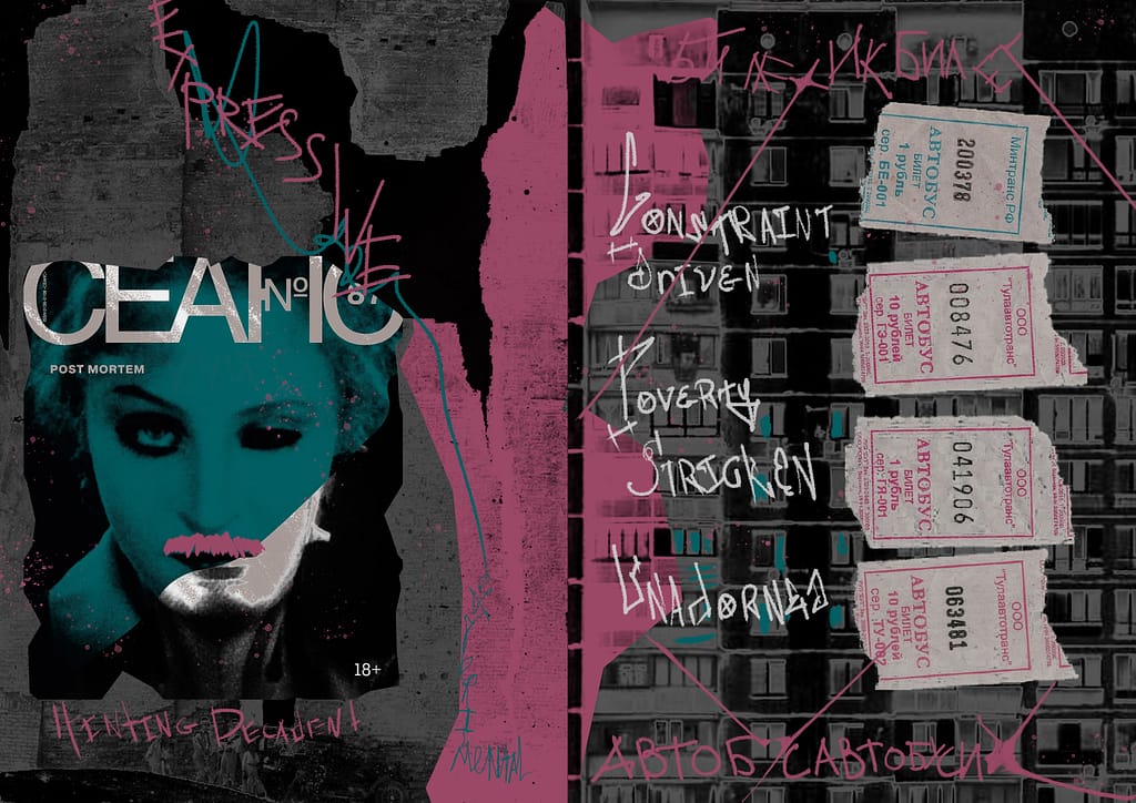Spread 1: Off Grid is inspired by street graffiti and the layered visual language of the urban environment. The composition is based on the cover of СЕАНС magazine, an issue dedicated to ruins and decay: black-and-white photographs of destroyed walls form the background, partially overpainted in pink as a gesture of intervention and reinterpretation.