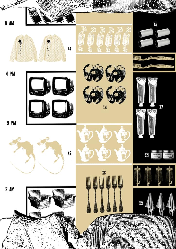 A line runs from top to bottom, showing which rooms I spend time in throughout the day. Within each room’s area, I’ve placed information about what is present there: stained clothes, mice that have been spotted, spoiled apples, dirty forks, etc.